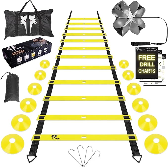 - Our soccer training equipment for kids 8-12 Includes 1 Speed Ladder, 12 Agility Cones, 4 Steel Pegs, 1 Speed Parachute, 1 Parachute Bag, 1 Carry bag, and User Manual