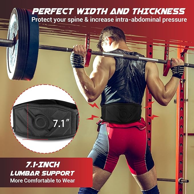 - [Perfect Squat Deadlift Powerlifting Belt] The weight lifting belts are designed with a 7.1" wide lumbar support that conforms to the natural curvature of the human body. The weighted belt not only creates even and consistent intra-abdominal pressure to increase core strength and balance while lifting weights, but also effectively prevents back strain caused by hyperextension or flexion of the spine. The weight belt is lined with a comfortable and breathable composite EVA sandwich mesh fabric that provides excellent breathability and is refreshingly non-stuffy.