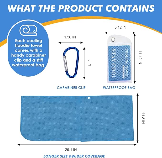 - 【DESIGN FEATURES】: Measuring "29x12", the cooling hoodie towel offers ample coverage for your neck and face and other body areas. Expanding the size brings better cooling effects. Crafted from high-quality materials, these towels are durable and longevity, providing a dependable, cost-effective cooling solution for the long term. Feel free to contact us for any issues.
