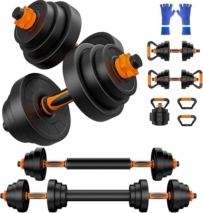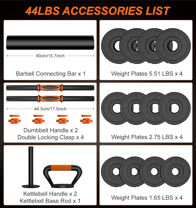 - 【Flexible Weight Options】: With a total weight of 44 pounds and adjustable dumbbell plates,(4pcs 5.5lbs, 4pcs 2.75lbs,4pcs 1.65lbs,2pcs dumbbell bar, 1pcs connector and 4pcs double nuts) you can tailor your workout intensity to your specific goals and fitness level. By converting dumbbells into barbells with connecting rods, one can engage in full body muscle exercises.