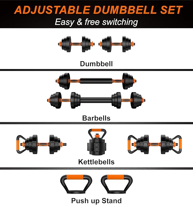 - 【DICAO 4-in-1 Multifunctional Set】: Elevate your home gym experience with our updated 44lbs adjustable dumbbell set. Seamlessly switch between dumbbells, barbells, and push-up stands, offering endless possibilities for sculpting your ideal physique.