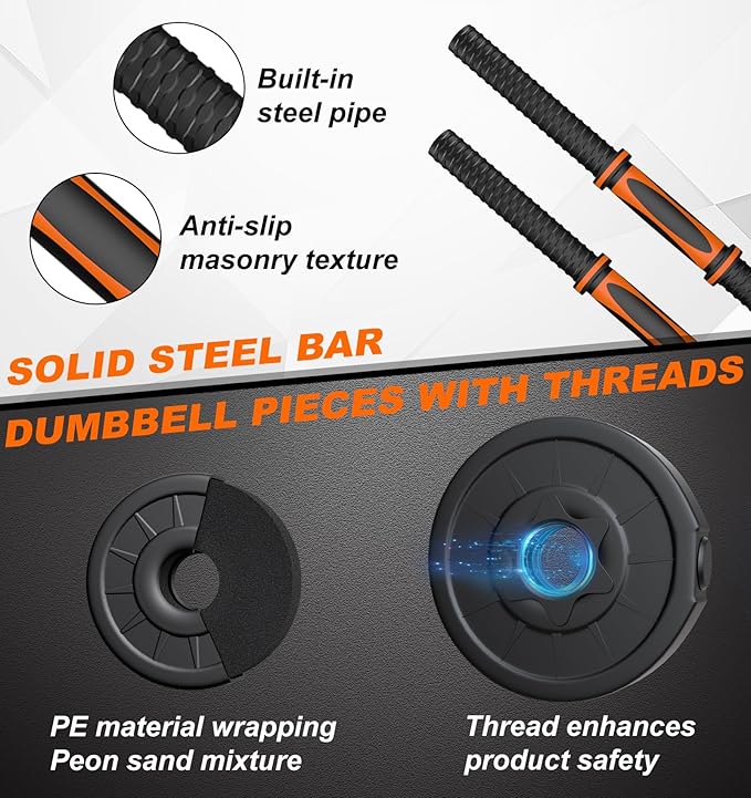 - 【Thick barbell bar Design】: Engineered for comfort and safety, our dumbbell set features a thickened sponge grip rod with anti-slip dumbbell bar for a secure hold. The dumbbell weights connecting rod's thickened sponge prevents slippage and absorbs moisture, ensuring a comfortable and effective workout every time.