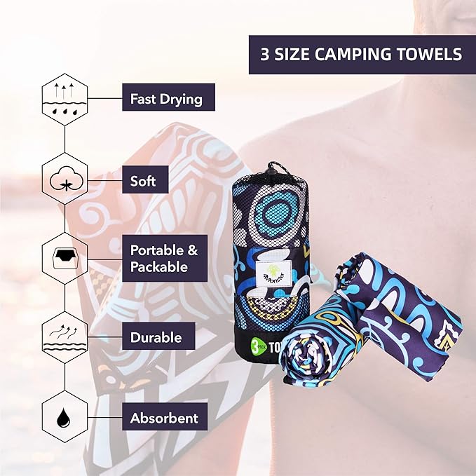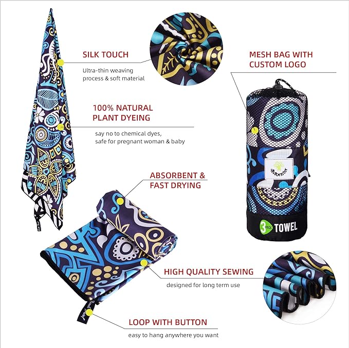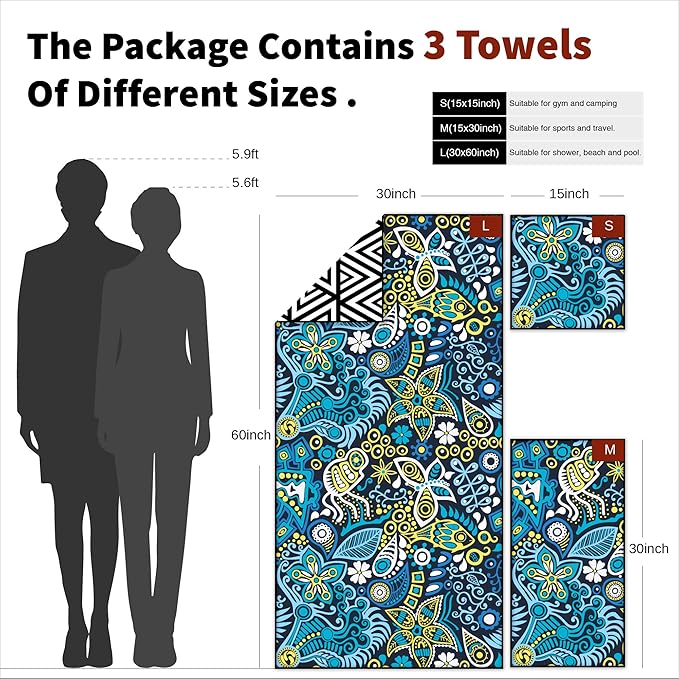 - 【3 Towels at 1 Pack】The package contains 3 towels of different sizes, (S:15''x15'') is a small hand towel and prefect for gym and yoga class,light and soft, absorb sweat quicker than you imagine.(M:30''x15'') is a prefect camping towel and you’ll find the size just designed for traveling.(L:60''x30''),the biggest towel in the package,the size is for shower,beach and pool,large yet light and portable.