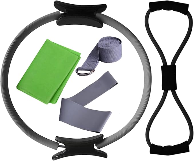 - PRODUCTS INCLUDED: Pilates ring, latex elastic band, yoga rally strap, pull rope, 8-shaped resistance bands for arms.