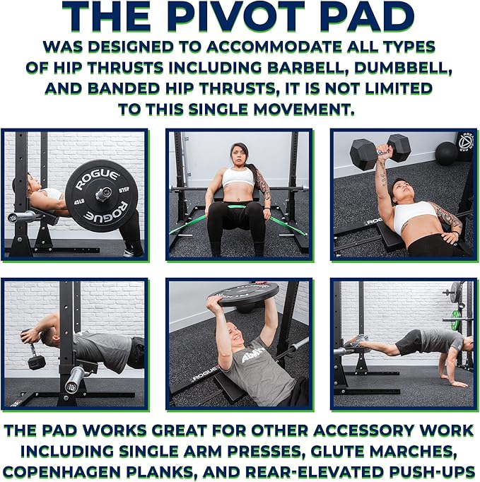 - Versatile- Though the Pivot Pad was designed to accommodate all types of hip thrusts including barbell, dumbbell, and banded hip thrusts, it is not limited to this single movement. The pad works great for other accessory work including single arm presses, glute marches, Copenhagen planks, and rear-elevated push-ups to name a few.