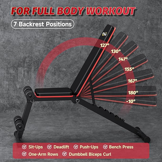 • 【VERSATILE DESIGN】The weight benches for home gym is a versatile piece of equipment that can be used for a variety of exercises, including chest presses, shoulder presses, bicep curls, tricep extensions, and more. It can also be used in combination with other equipment, such as dumbbells and resistance bands.