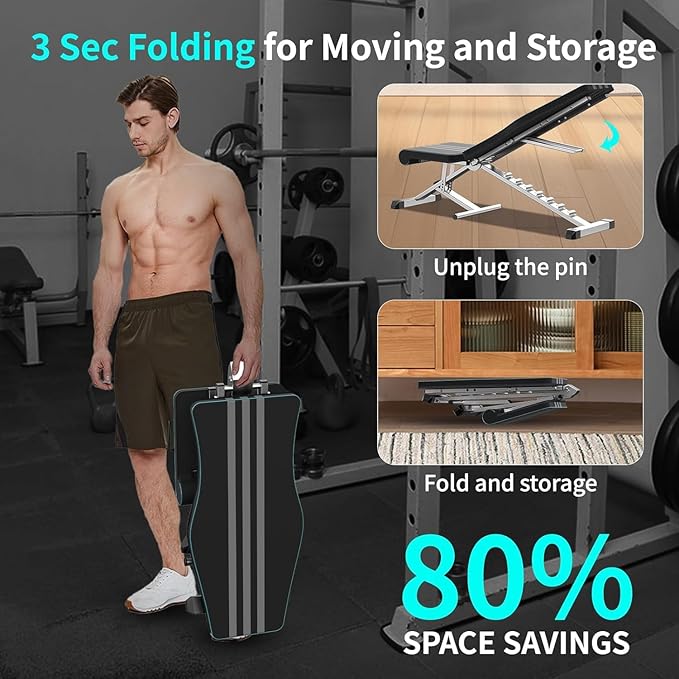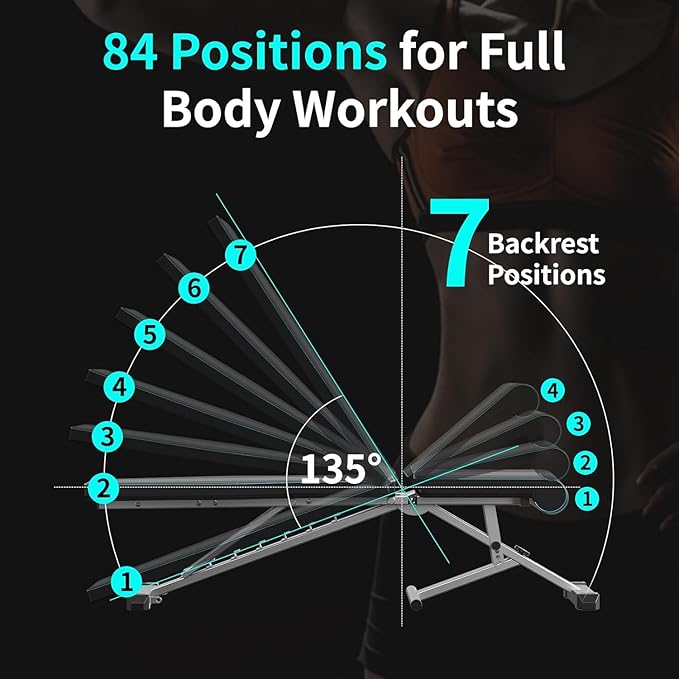 - 🔧【𝐕𝐞𝐫𝐬𝐚𝐭𝐢𝐥𝐞 𝐀𝐝𝐣𝐮𝐬𝐭𝐚𝐛𝐢𝐥𝐢𝐭𝐲】With a total of 84 adjustable options, this adjustable weight bench offers flexibility for your fitness routine. Featuring 7 back adjustments, 4 seat adjustments, and 3 leg adjustments, it can function as an incline, decline, or flat bench. The ladder-style adjustment mechanism allows users to quickly and securely change positions in a matter of seconds.