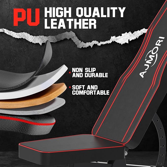 - 【Comfortable & Ergonomic Design】The Ajmori workout bench features the latest non-slip leather and 5 layers of high-density padding, The soft leather surface and high-density foam padding of the workout bench firmly immobilizes the body and reduces muscle fatigue during exercise. The workout bench supports your body during your workout so that you can perform various exercises in comfort.