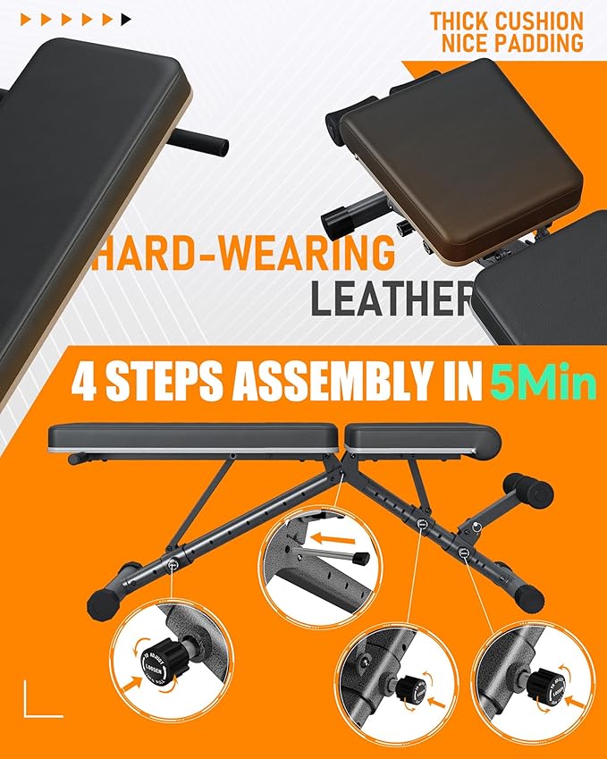 • QUICK & SECURE ADJUSTMENTS: The workout bench's sturdy knob adjusts backrest & cushion easily. Rotate halfway, pull out, and lock in 10 back & 7 seat positions for a personalized workout.