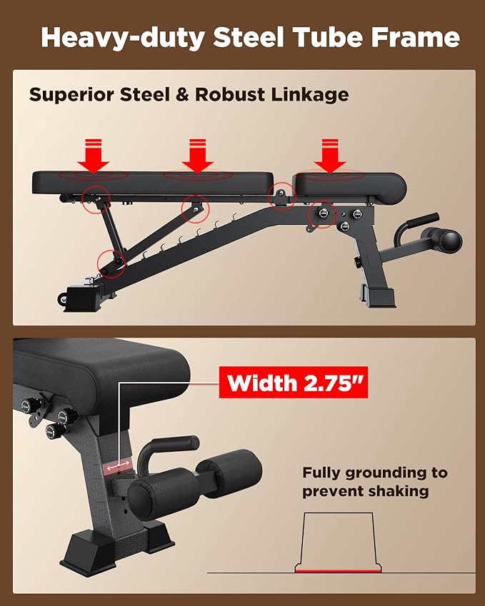 • 1200 LB MAX WEIGHT CAPACITY: Constructed with superior heavy-duty commercial-grade steel from our 2024 upgrade,and featuring a unique triangular support structure with a widened base, this bench ensures the utmost safety of users.One-piece construction almost replaces the folding function for greater load capacity(1200LB) and stability.