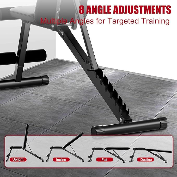 - Adjustable for Multiple Angles: The workout bench features an 8-position adjustable backrest, allowing you to switch between incline, flat, and decline positions. This versatility meets a wide range of exercise needs, helping you target different muscle groups effectively.
