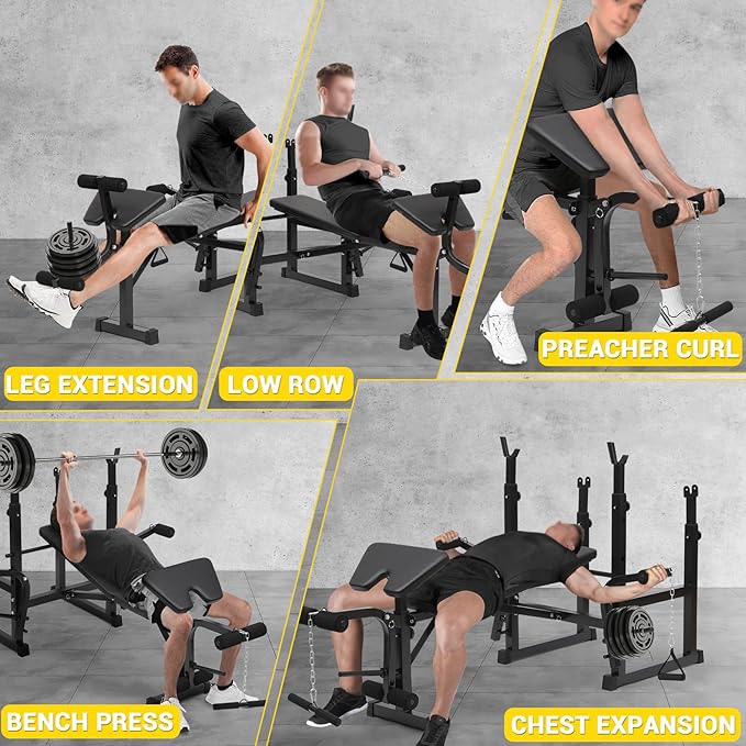 - 💪Multi-functional Weight Bench Set: The work out bench for home is suitable for full-body workouts, including bench press, preacher curl, butterfly chest, leg extension, leg curl, low rowing, sit-ups, squats, and other exercises. Through these exercises, you can effectively engage in full-body training.
