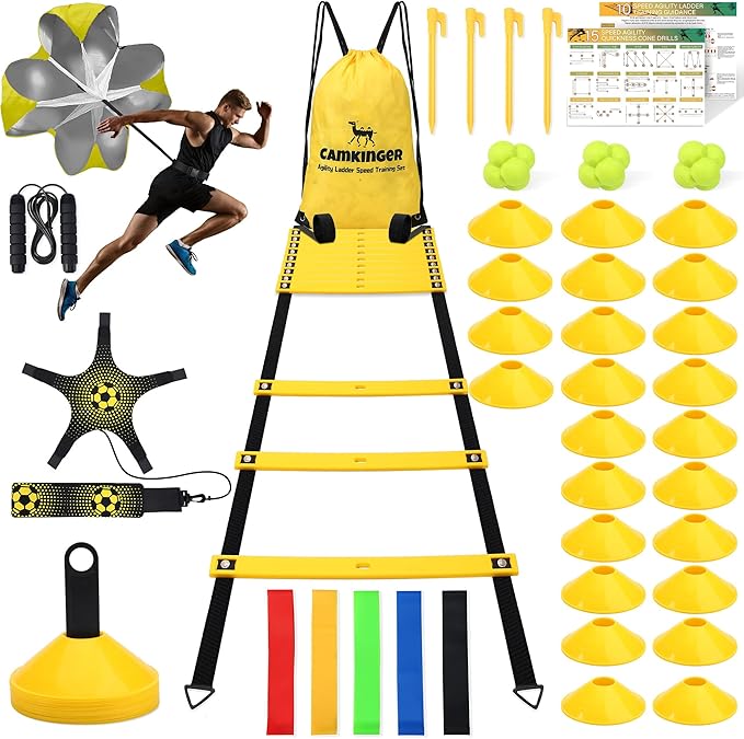 - Agility Training Equipment Kit: Includes 20ft 12 rungs advanced agility ladder with fixable 4 pegs, resistance parachute, 24 yellow disc soccer cones with cone holder, 5 resistance bands, 3 reaction balls, solo soccer trainer belt, and jump rope.Whether you are a beginner or an expert, the agility training equipment can meet your training requirements.