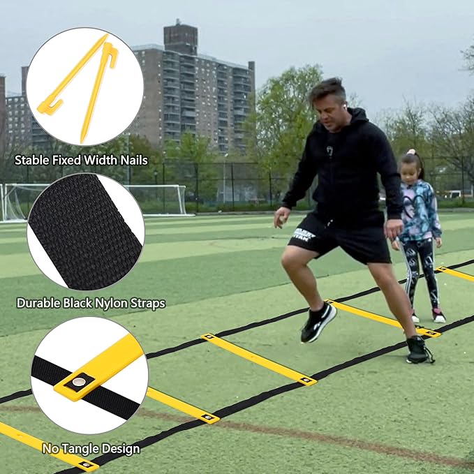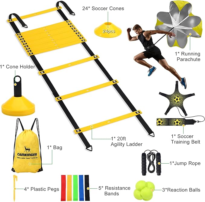 - Agility Training Equipment Kit: Includes 20ft 12 rungs advanced agility ladder with fixable 4 pegs, resistance parachute, 24 yellow disc soccer cones with cone holder, 5 resistance bands, 3 reaction balls, solo soccer trainer belt, and jump rope.Whether you are a beginner or an expert, the agility training equipment can meet your training requirements.