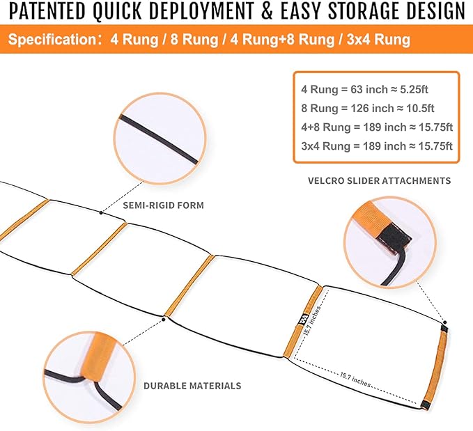 • ✔MULTIFUNCTIONAL TRAINING EQUIPMENT: Our patented design features three products in one: Agility Ladder, Hurdle, and Wall. With slidable rungs and extendable hook and loop design, you can quickly adjust the workout ladder, even on the fly, to various configurations , while reducing the amount of equipment to be hauled to each training venue. Now you can give your team drills a whole new dimension, and more exciting ways of developing speed, agility, and coordination.