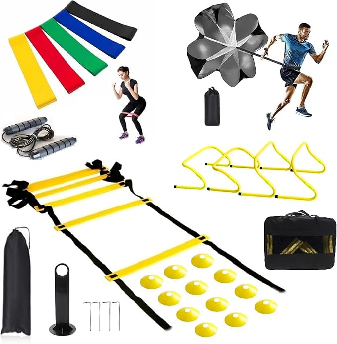 - 【Agility Ladder Training Kit】It includes a 12 rungs 20Ft agility ladder, 1 running resistance parachute, 4 Hurdles, 12 disc cones, 4 steel stakes, 5Pcs resistance bands, 1 Skipping Rope, and 1 storage bag.