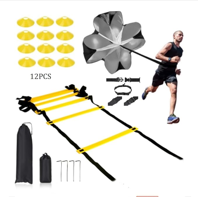 - 【Agility Ladder Training Kit】It includes a 12 rungs 20Ft agility ladder, 1 running resistance parachute, 4 Hurdles, 12 disc cones, 4 steel stakes, 5Pcs resistance bands, 1 Skipping Rope, and 1 storage bag.
