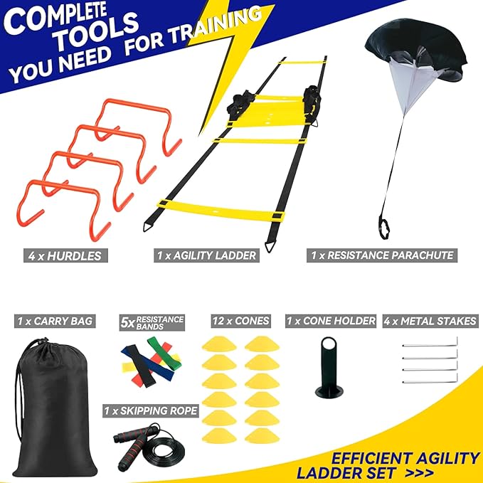 - 【Complete Agility Training Kit】This agility ladder training equipment set comes with everything you need to improve your speed and agility on the field or court. Includes a 20ft agility ladder for footwork drills, a parachute provides added resistance to help build power, 4 hurdles to improve jumping ability, 12 disc cones for marking off training areas, 1 jump rope for building endurance, 5 exercise bands for strength training and 4 steel stakes to anchor the equipment in place.