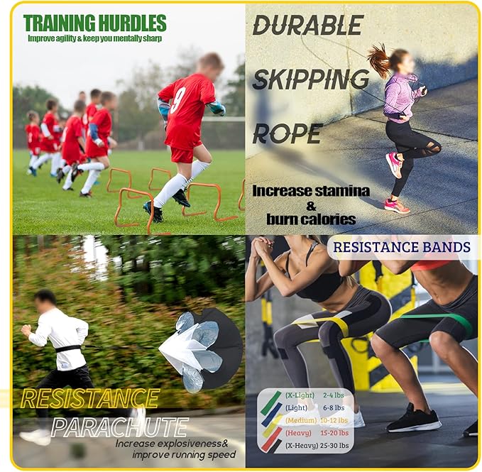 - 【For All Ages & Levels】The set is suitable for kids, athletes, children, adults, coaches, sports and fitness enthusiasts. It can greatly help to increase the speed, strength and endurance of the legs. And improve the agility, flexibility as well as coordination of the body. An ideal gift for your family or friends to train football, soccer, basketball, baseball, lacrosse, volleyball, softball, tennis, track, ice hockey, rugby, etc.