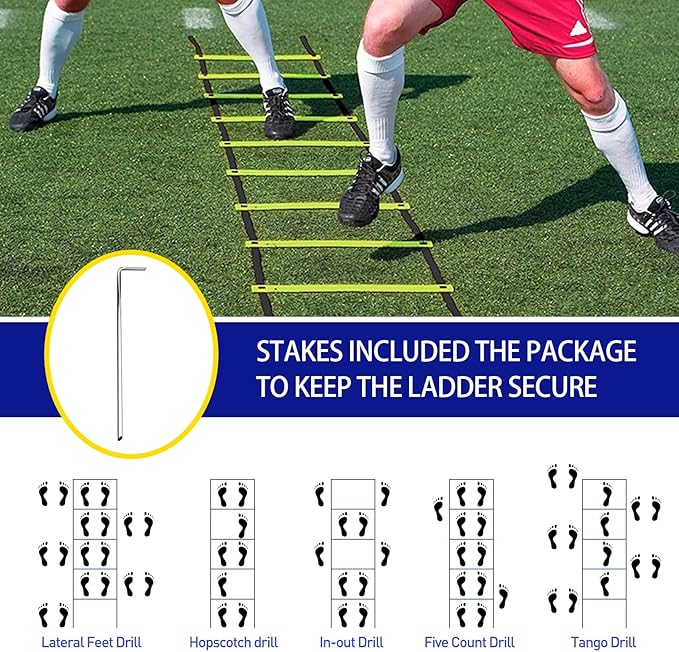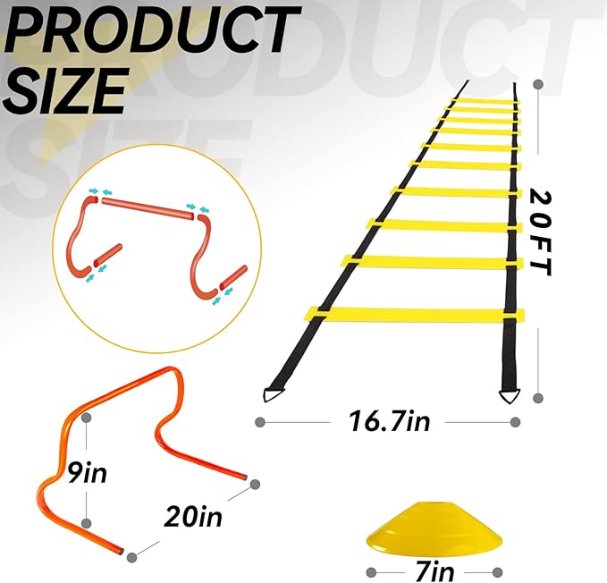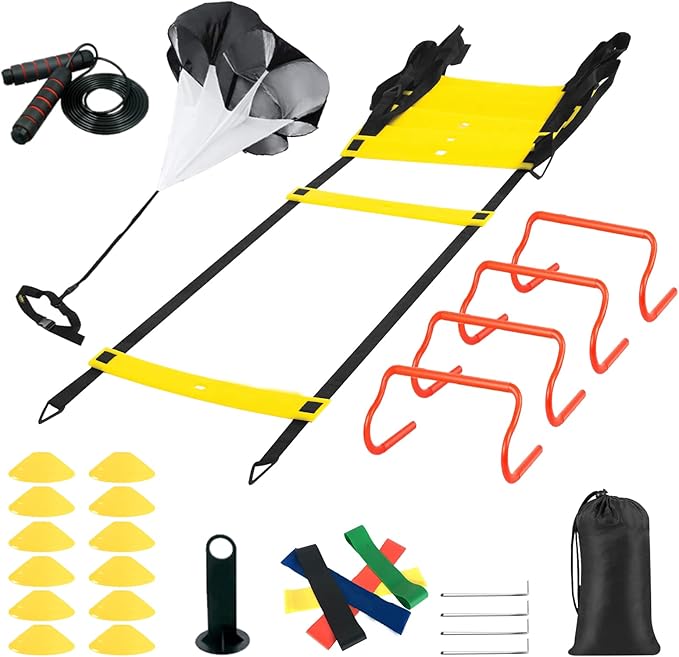 - 【Complete Agility Training Kit】This agility ladder training equipment set comes with everything you need to improve your speed and agility on the field or court. Includes a 20ft agility ladder for footwork drills, a parachute provides added resistance to help build power, 4 hurdles to improve jumping ability, 12 disc cones for marking off training areas, 1 jump rope for building endurance, 5 exercise bands for strength training and 4 steel stakes to anchor the equipment in place.