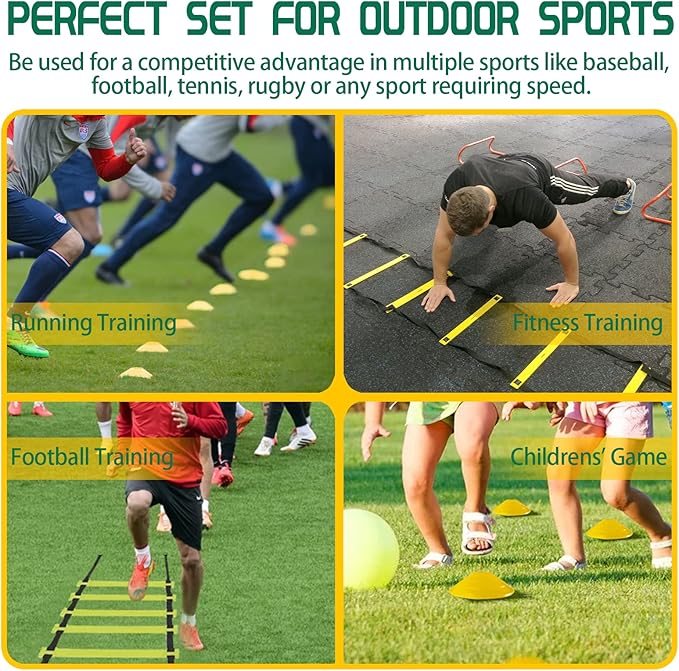 - 【For All Ages & Levels】The set is suitable for kids, athletes, children, adults, coaches, sports and fitness enthusiasts. It can greatly help to increase the speed, strength and endurance of the legs. And improve the agility, flexibility as well as coordination of the body. An ideal gift for your family or friends to train football, soccer, basketball, baseball, lacrosse, volleyball, softball, tennis, track, ice hockey, rugby, etc.