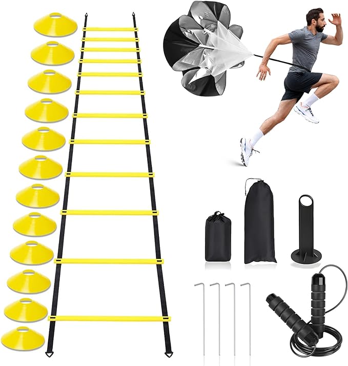 - 【Football Training Equipment Set】 Includes 1 yellow speed training ladder with 4 steel spikes (20 feet long, 12 rungs), 12 football cones, 1 running resistance umbrella, 1 jump rope, 1 carry bag. It can meet your training requirements and make your life healthier.