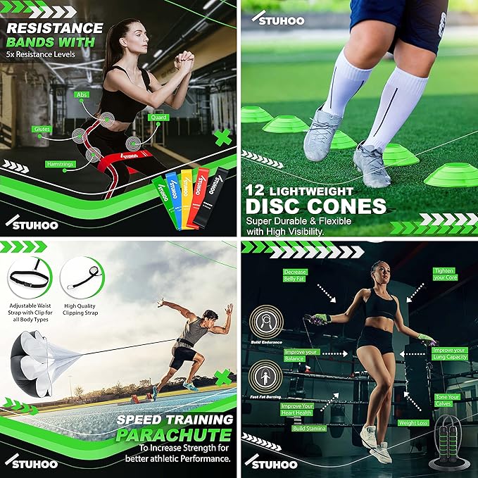 - 【The Perfect Agility Training Equipment Set】: STUHOO brings a versatile soccer training equipment that includes 20 ft Agility Ladder, Parachute for speed training, Jump Rope, 5 Resistance Bands, 12 Disc Cones with holder, 2 Double-Sided Drill Guides, & Polyester Gym Bag; our football training equipment comes with a passion to make your life more fitter