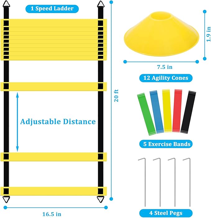 - Versatile Training Set: Includes 20-foot agility ladder, 12 yellow cones, 4 stakes, and 5 resistance bands for comprehensive speed and agility drills.
