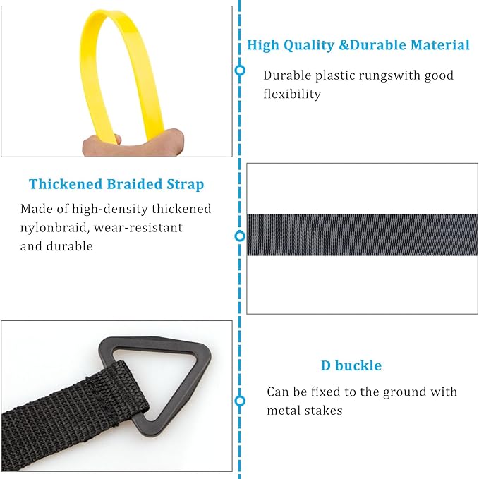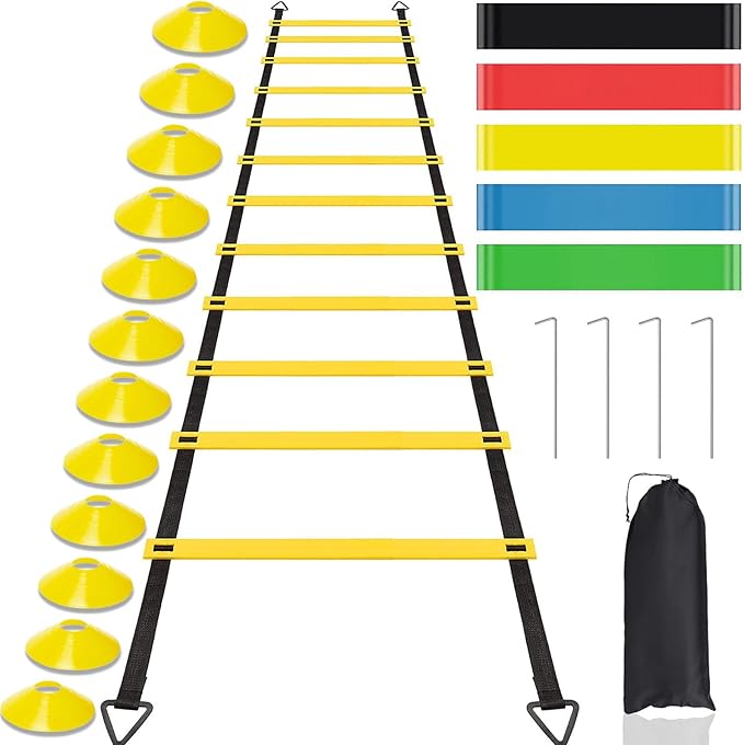 - Versatile Training Set: Includes 20-foot agility ladder, 12 yellow cones, 4 stakes, and 5 resistance bands for comprehensive speed and agility drills.