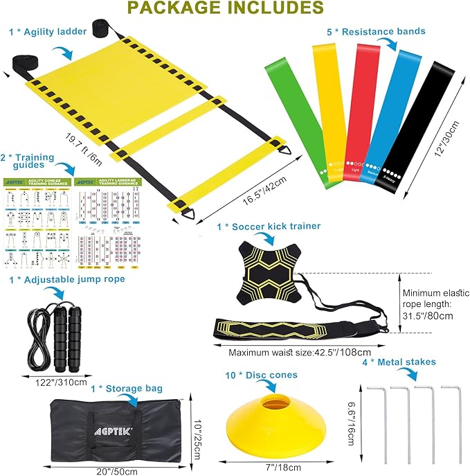 - Comprehensive Training Equipment Set: AGPTEK offers a complete array of training tools including 1 agility ladder(20ft long 12 rungs), 1 soccer kick trainer, 10 cones, 4 metal stakes, 1 adjustable jump rope, 5 resistance bands, 2 paper training guides and 1 carry bag, providing everything needed for effective speed and agility workouts.