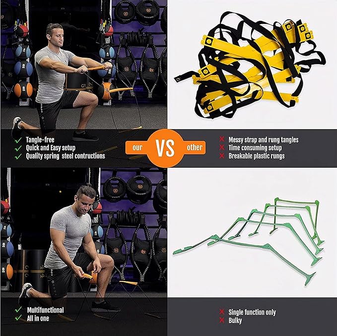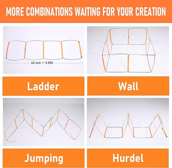 - ✔PATENTED DESIGN:Our patented design has multiple functions. It combined the function of the ladder and hurdles. Agility ladder set can expand your training mode in multiple dimensions by configuring the agility ladder to different shapes. If we fix it to football hurdles shapes, it can help enhancing user's dynamic flexibility, coordination and balance. Sports ladder kit gives you more possibilities for training and performance.