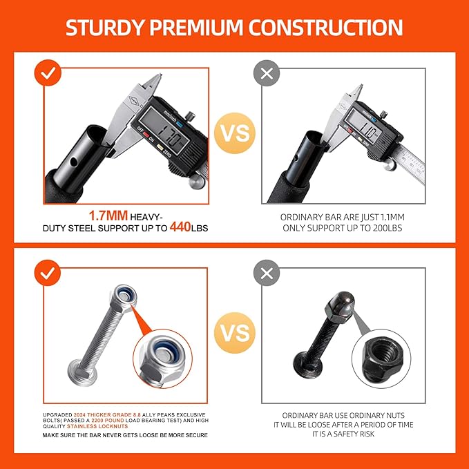 - 💪1.HEAVY DUTY CONSTRUCTION: The pull up bar make of 1.7mm thickened refined heavy steel and the fine powder coating prevent rust and corrosion.And we use high quality lock nuts make sure the bar never gets loose. It is much better than ordinary one just for the extra safety .It can hold up to 440 pounds. And the handles are coated with high fiber foam, comfortable grip, multi-function, anti-slip and wear resistance.