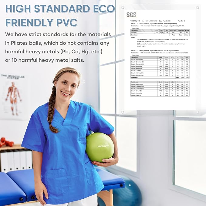 - [SAFE MATERIAL] The 9 inch workout ball is crafted from high-quality, eco-friendly PVC material, these exercise balls physical therapy meet strict standards to ensure safety and durability. They are soft, flexible, and skin-friendly, containing no harmful heavy metals such as Pb, Cd, Hg, etc., or 10 harmful heavy metal salts.