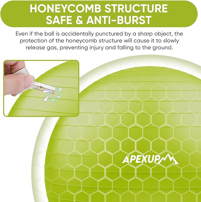 • [SAFE & ANTI BURST] APEXUP Exercise ball is made of high-quality, eco-friendly PVC material, which meets stringent safety standards. It's non-toxic, odorless, and free from harmful heavy metals. With an anti-burst honeycomb structure, it ensures durability and safety during your workouts.
