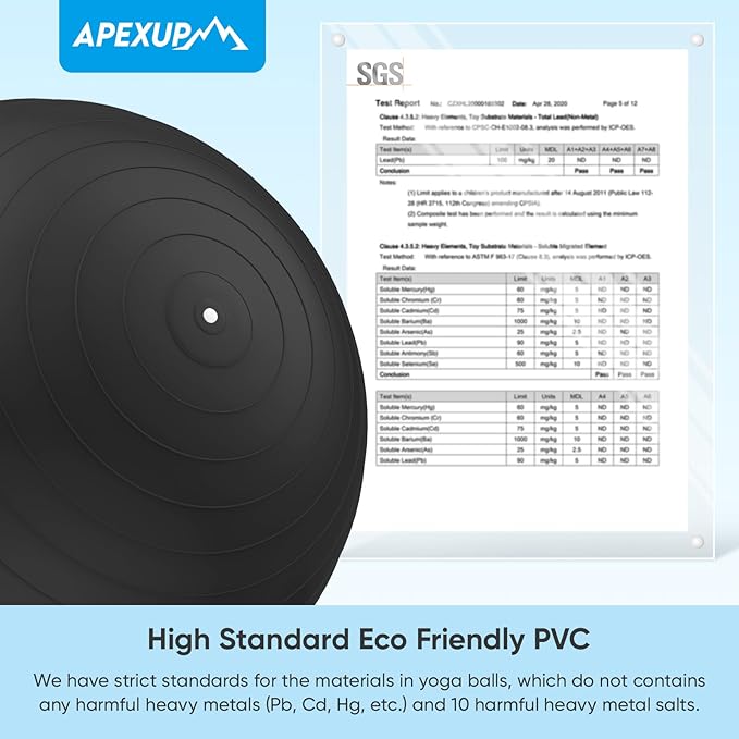 • [SAFE AND ANTI BURST] APEXUP Exercise ball is made of high-quality, eco-friendly PVC material, which meets stringent safety standards. It's non-toxic, odorless, and free from harmful heavy metals. With an anti-burst honeycomb structure, it ensures durability and safety during your workouts.