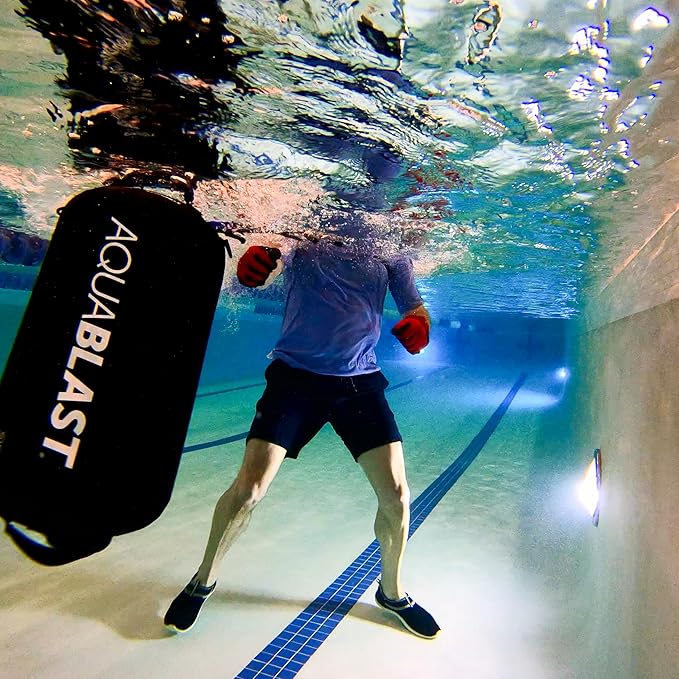 - AquaBLAST 20-Liter, the first portable fitness and kickboxing bag for swimming pools and swim spas. Now completely redesigned. AquaBLAST uses pool water and is fluid, so it ""floats"" underwater, placing it in position for lifting, pushing and pulling, or use it for full-contact kickboxing in 3-5 feet of water.