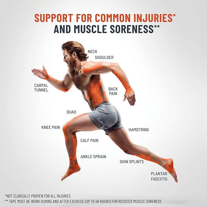 - Versatile application: Easily self-apply KT Tape for back, knee and shoulder pain, plantar fasciitis, tennis elbow and more; Cut strips into smaller widths or lengths when you need a more personalized fit; Apply correctly with the KT App!