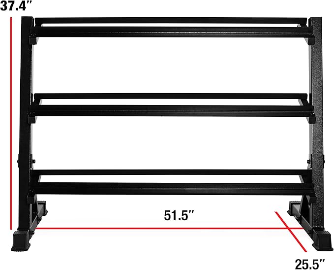- FEATURES: 3 shelves with 51 inches of storage space per shelf that’s over 150 inches of storage room for your dumbbells; Lower 2 shelves are angled; Accommodates multiple sizes of dumbbell