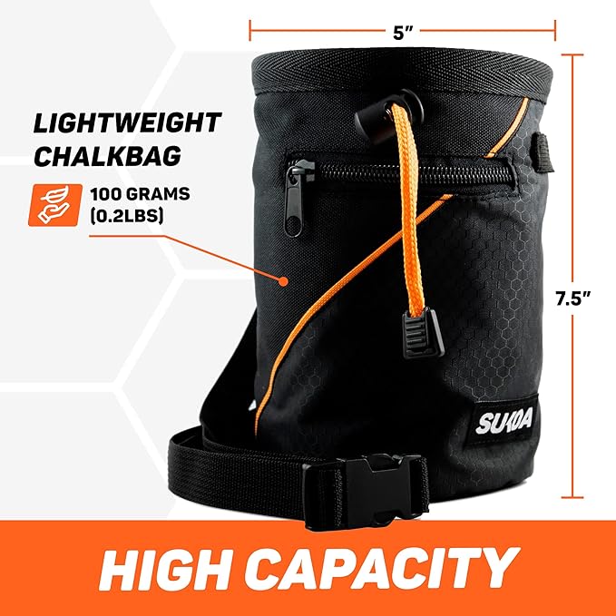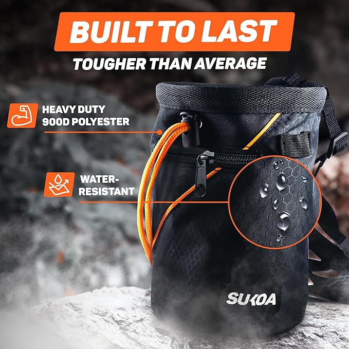 - Premium-Quality Rock Climbing Gifts For Beginners & Experienced Climbers. Made from water-resistant material, 900D polyester fabric and high quality materials, Sukoa Chalk Bag is a tough, rugged chalk bucket that will last for years to come. Available in a range of colors to suit your personal style. Order Now.