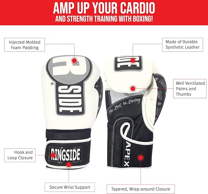 - Boxing Gloves: Fight your way to the top with Ringside’s Apex Boxing Bag Gloves. These durable synthetic leather gloves will help you push your body to the limit every time and allow you to reach your fitness and athletic goals.