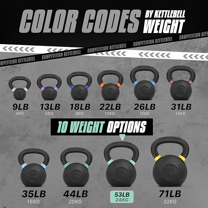 - COLOR-CODED RINGS and DUAL MARKINGS FOR BOTH LB and KG: Color-coded rings make different weights easy to identify at a glance. Each kettlebell is labeled with both LB and KG. No need to use the calculator to figure out how much you are swinging.