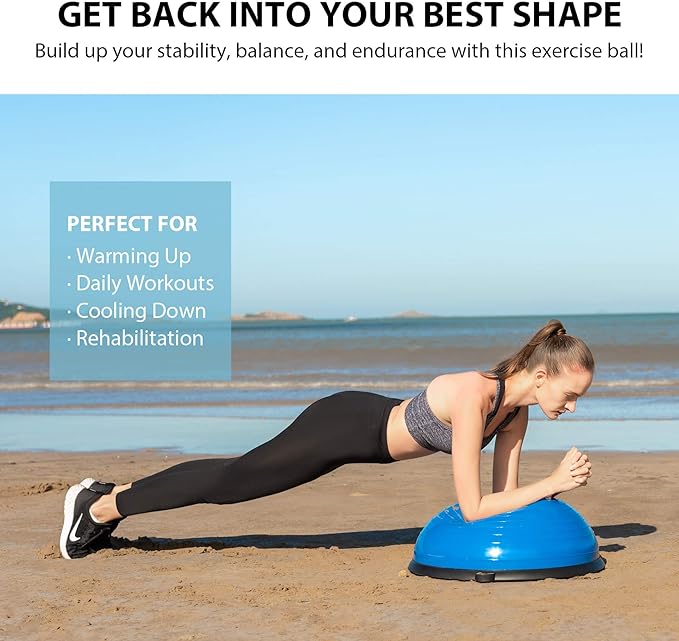 - BALL PUMP INCLUDED: A complete combo, this half-dome stability ball comes with a complimentary foot pump that makes it easy to get fully inflated to 9.8” in under 5 minutes. The ball’s high-quality air valve prevents air leakage and extends service life