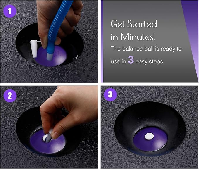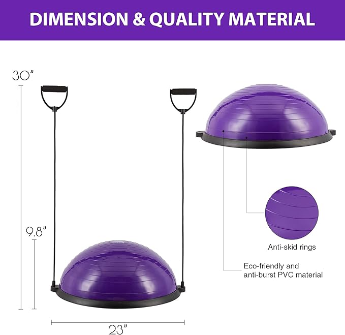 - BALL PUMP INCLUDED: A complete combo, this half-dome stability ball comes with a complimentary foot pump that makes it easy to get fully inflated to 9.8” in under 5 minutes. The ball’s high-quality air valve prevents air leakage and extends service life.