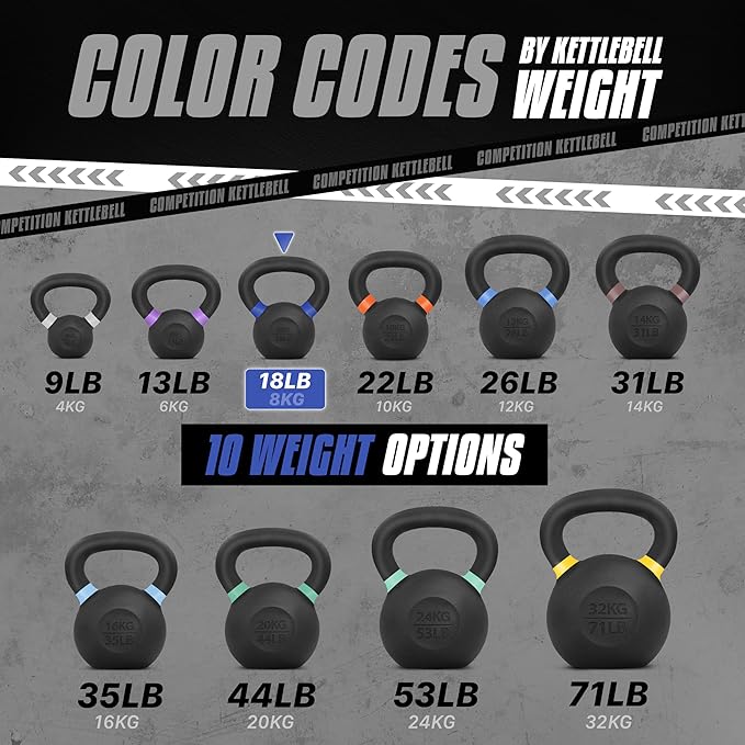 - SOLID CAST IRON: Challenge yourself with 18 Lbs strength training kettlebells, actual weight can range from 17.46LB to 18.54LB; The powder coating prevents corrosion and provides a better grip, eliminating the slipping common with glossy finishes