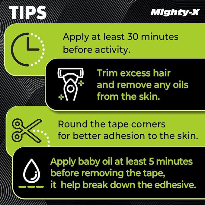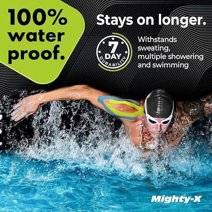 - 100% WATERPROOF – Mighty-X k tape for knee pain is designed to withstand heavy sweating and multiple showers. The nylon sports tape athletic kinesiology material doesn’t absorb moisture and dries quickly, so you can get back to your routine right after a shower.
