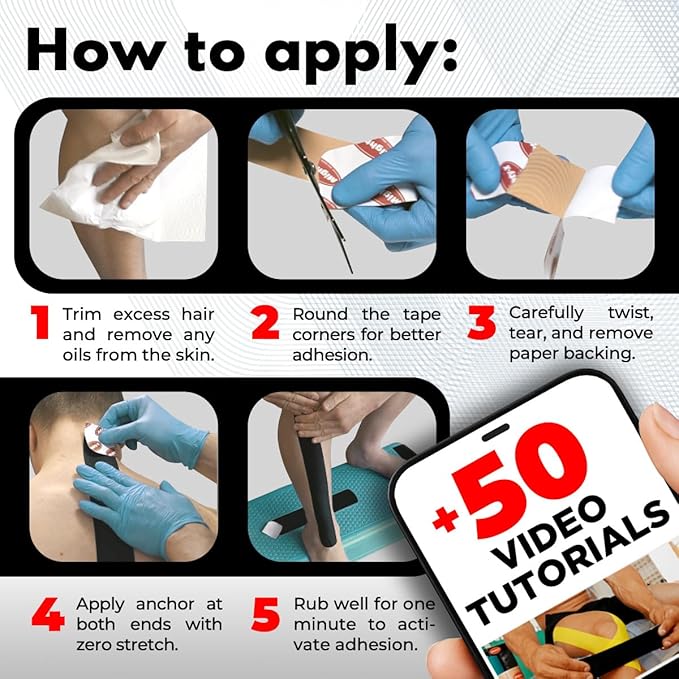 - 50 FREE VIDEOS INCLUDED – We provide 50 FREE, step-by-step instructional videos of kinetic tape roll applications for the most common muscle and joint injuries to ensure you find the correct one for the fastest recovery.