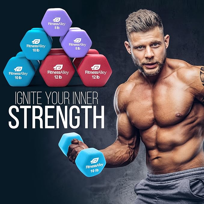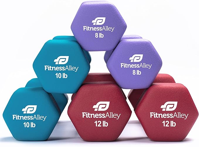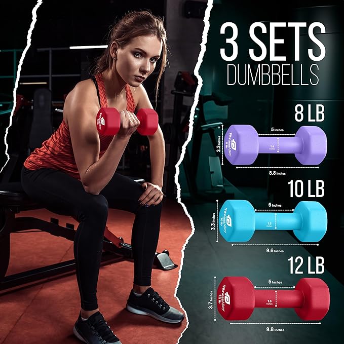 - The box includes 3 dumbbells pairs (8LB, 10LB and 12LB) with various colors. is of superior quality along with neoprene gripping that allows lifting of heavyweights simpler and easier