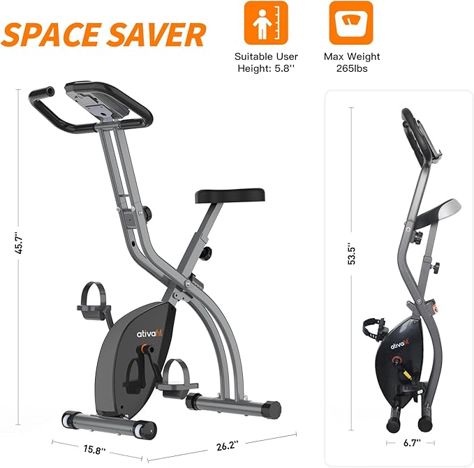 - FOLDING & SPACE SAVING DESIGN: Our Ativafit folding exercise bike allows you to easily store it in a compact space. With 7 adjustable seat height options, you can easily find the perfect position for optimal comfort. The recommanded Height is 5.8''. The smooth-rolling wheels allow you to move the bike around your home.