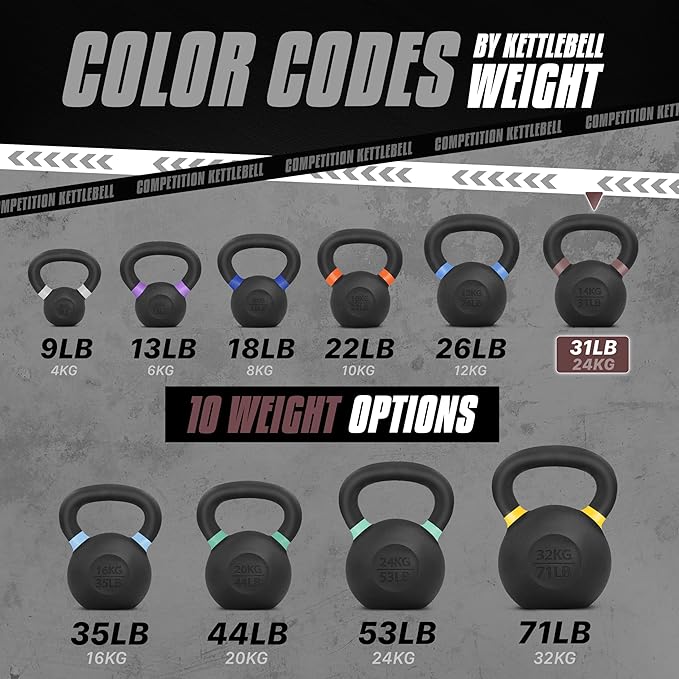- SOLID CAST IRON: Challenge yourself with 31 Lbs strength training kettlebells, actual weight can range from 30.07LB to 31.93LB; The powder coating prevents corrosion and provides a better grip, eliminating the slipping common with glossy finishes
