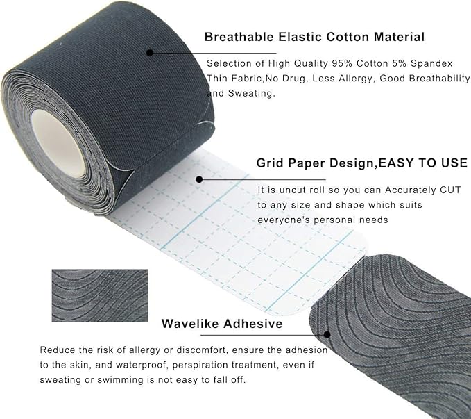 - MUEUSS Kinesiotape Tape is made from 95% Cotton 5% Spandex thin fabric, porous fabric makes skin breathe better beneath the tape, moisture-wicking,humidity resistance, Lightweight and comfortable,provides both support & mobility and based on athletic tape standard to help you get through Weightlifting, rock climbing, judo, football, volleyball, gymnastics, baseball, hockey.